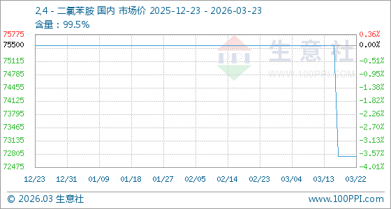 3月23日,生意社2,4-二氯苯胺基准价为72750.00元/吨,与本月初(75500.00元/吨)相比,下降了3.64%。