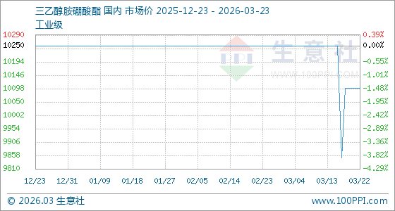 3月23日,生意社三乙醇胺硼酸酯基准价为10100.00元/吨,与本月初(10250.00元/吨)相比,下降了1.46%。