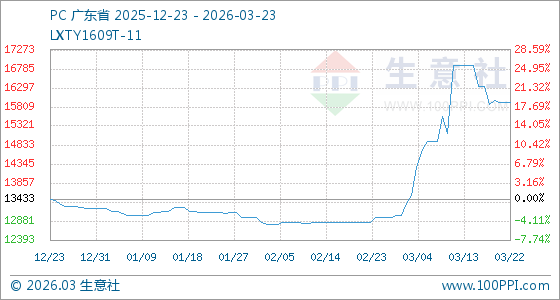 3月23日,生意社PC基准价为15933.33元/吨,与本月初(13026.67元/吨)相比,上涨了22.31%。