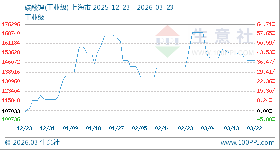 3月23日生意社碳酸锂(工业级)基准价为148000.00元/吨