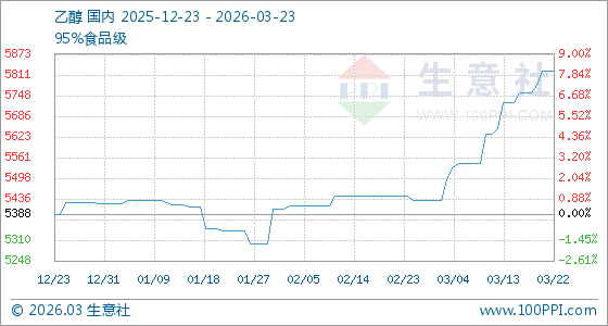 3月23日,生意社乙醇基准价为5821.67元/吨,与本月初(5431.11元/吨)相比,上涨了7.19%。