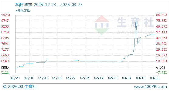 3月23日,生意社苯酐基准价为8566.67元/吨,与本月初(6150.00元/吨)相比,上涨了39.30%。