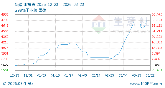 3月23日,生意社硫磺基准价为4816.67元/吨,与本月初(3910.00元/吨)相比,上涨了23.19%。