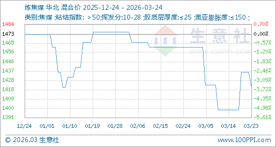 3月24日生意社炼焦煤基准价为1421.25元/吨