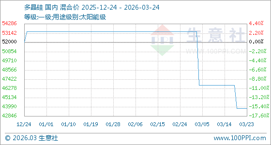3月24日,生意社多晶硅基准价为43800.00元/吨,与本月初(53333.33元/吨)相比,下降了17.87%。