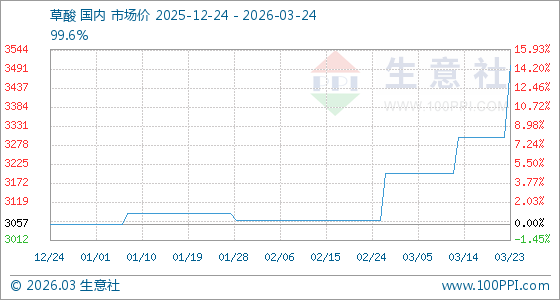 3月24日,生意社草酸基准价为3500.00元/吨,与本月初(3200.00元/吨)相比,上涨了9.38%。