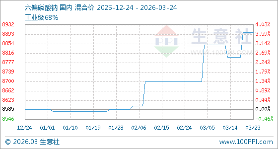 3月24日,生意社六偏磷酸钠基准价为8900.00元/吨 ,与本月初(8700.00元/吨 )相比,上涨了2.30%。