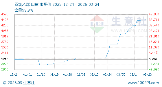 3月24日,生意社四氯乙烯基准价为4455.56元/吨,与本月初(3683.33元/吨)相比,上涨了20.97%。