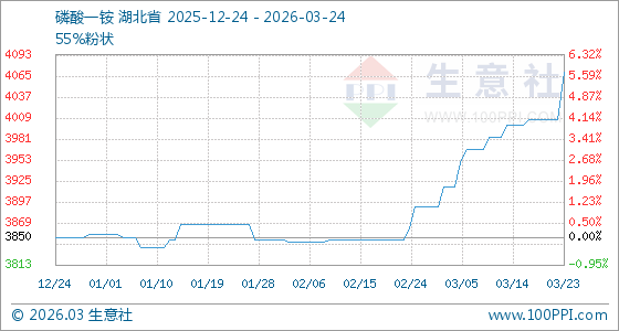 3月24日,生意社磷酸一铵基准价为4070.00元/吨,与本月初(3890.00元/吨)相比,上涨了4.63%。