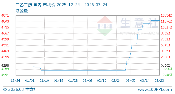 3月24日,生意社二乙二醇基准价为4815.00吨,与本月初(4248.33吨)相比,上涨了13.34%。