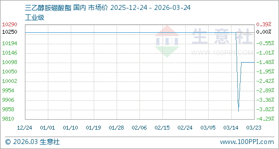 3月24日,生意社三乙醇胺硼酸酯基准价为10100.00元/吨,与本月初(10250.00元/吨)相比,下降了1.46%。