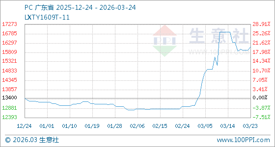 3月24日,生意社PC基准价为16110.00元/吨,与本月初(13026.67元/吨)相比,上涨了23.67%。