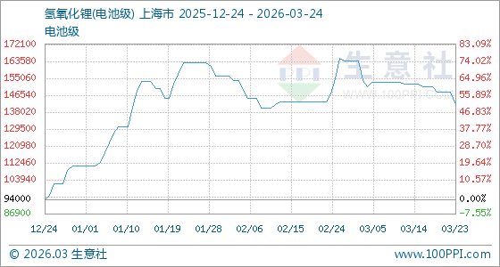 3月24日,生意社氢氧化锂(电池级)基准价为142000.00元/吨,与本月初(164000.00元/吨)相比,下降了13.41%。