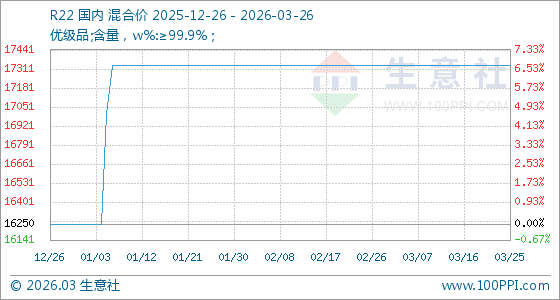 3月26日,生意社R22基准价为17333.33元/吨,与本月初持平。