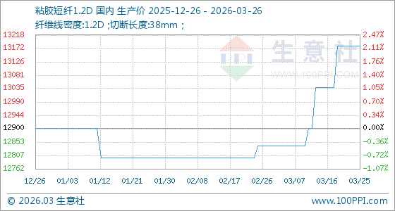 3月26日,生意社粘胶短纤1.2D基准价为13180.00元/吨,与本月初(12840.00元/吨)相比,上涨了2.65%。