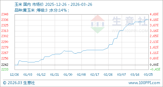 3月26日,生意社玉米基准价为2337.14元/吨,与本月初(2285.71元/吨)相比,上涨了2.25%。