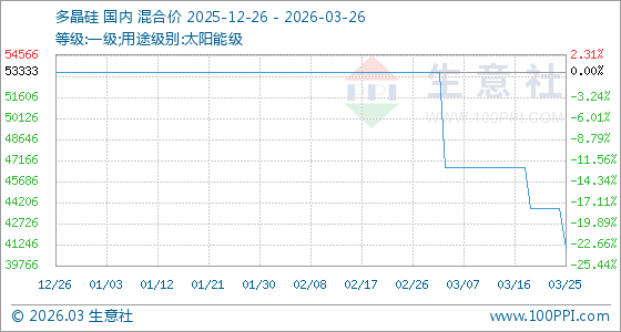 3月26日,生意社多晶硅基准价为41000.00元/吨,与本月初(53333.33元/吨)相比,下降了23.12%。