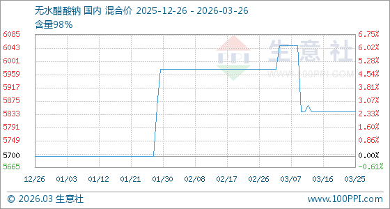 3月26日,生意社无水醋酸钠基准价为5840.00元/吨,与本月初(5975.00元/吨)相比,下降了2.26%。