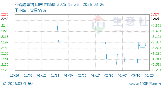 3月26日,生意社亚硫酸氢钠基准价为2200.00元/吨,与本月初(2133.33元/吨)相比,上涨了3.13%。
