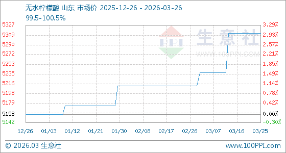 3月26日生意社无水柠檬酸基准价为5312.50元/吨