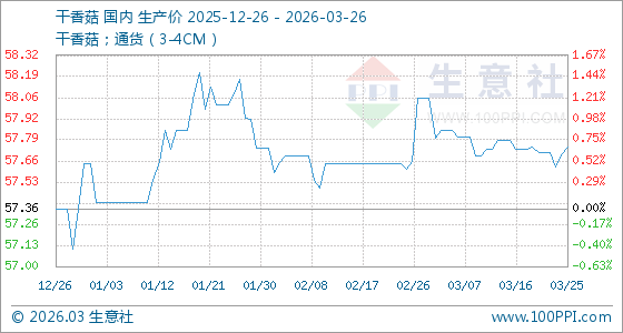 3月26日,生意社干香菇基准价为57.75元/公斤,与本月初(58.05元/公斤)相比,下降了0.52%。