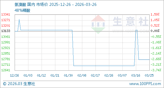 3月26日生意社氢溴酸基准价为12775.00元/吨