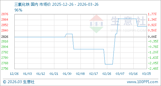 3月26日,生意社三氯化铁基准价为2850.00元/吨,与本月初(2766.67元/吨)相比,上涨了3.01%。