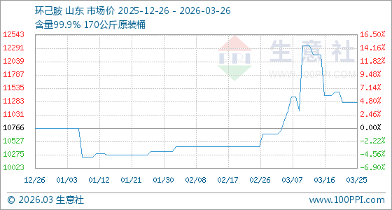 3月26日,生意社环己胺基准价为11266.67元/吨,与本月初(10666.67元/吨)相比,上涨了5.62%。