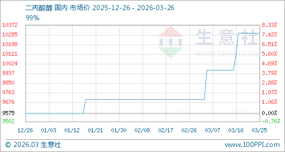 3月26日,生意社二丙酮醇基准价为10300.00元/吨,与本月初(9700.00元/吨)相比,上涨了6.19%。