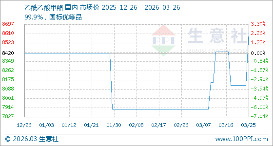 3月26日,生意社乙酰乙酸甲酯基准价为8625.00元/吨,与本月初(7900.00元/吨)相比,上涨了9.18%。