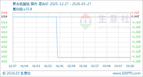 3月27日,生意社聚合硫酸铝基准价为1012.50元/吨,与本月初持平。