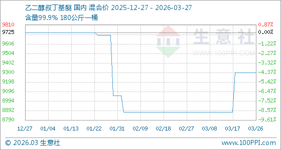 3月27日生意社乙二醇叔丁基醚基准价为9300.00元/吨