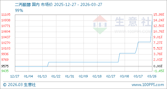 3月27日,生意社二丙酮醇基准价为10966.67元/吨,与本月初(9700.00元/吨)相比,上涨了13.06%。