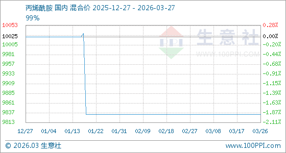 3月27日,生意社丙烯酰胺基准价为9833.33元/吨,与本月初持平。