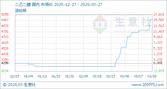 3月27日,生意社二乙二醇基准价为4981.67吨,与本月初(4248.33吨)相比,上涨了17.26%。