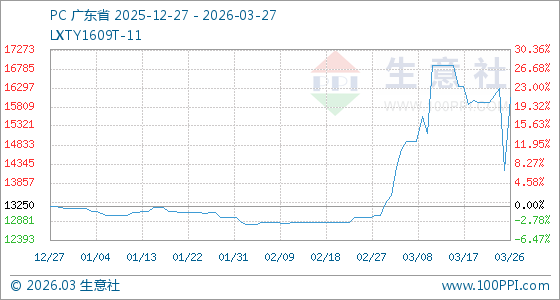 3月27日,生意社PC基准价为16060.00元/吨,与本月初(13026.67元/吨)相比,上涨了23.29%。