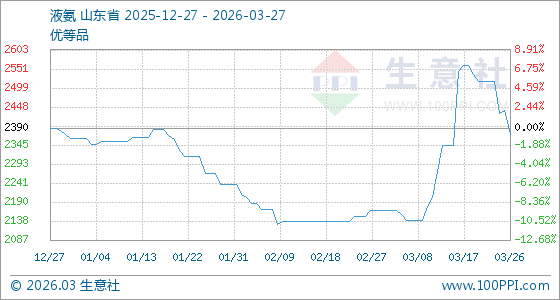 3月27日,生意社液氨基准价为2373.33元/吨,与本月初(2166.67元/吨)相比,上涨了9.54%。