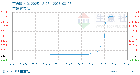 3月27日,生意社丙烯酸基准价为13116.67元/吨,与本月初(6350.00元/吨)相比,上涨了106.56%。