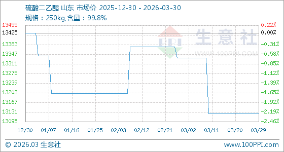 3月30日生意社硫酸二乙酯基准价为13125.00元/吨