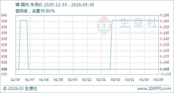 3月30日,生意社碘基准价为640.00元/千克,与本月初持平。