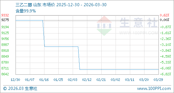 3月30日,生意社三乙二醇基准价为8700.00元/吨,与本月初持平。
