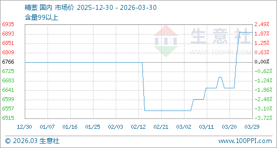 3月30日,生意社精萘基准价为6900.00元/吨,与本月初(6550.00元/吨)相比,上涨了5.34%。
