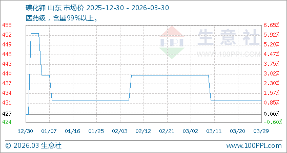 3月30日生意社碘化钾基准价为432.00元/公斤