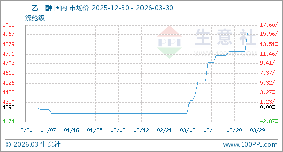 3月30日,生意社二乙二醇基准价为4981.67吨,与本月初(4248.33吨)相比,上涨了17.26%。