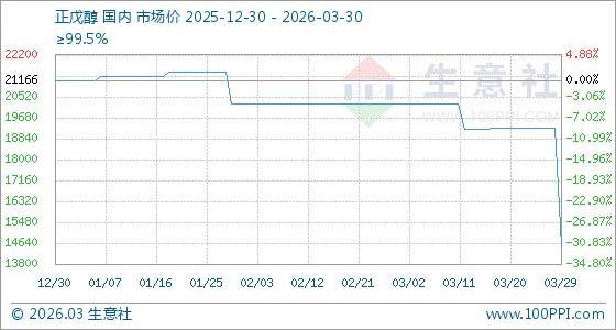 3月30日,生意社正戊醇基准价为14500.00元/吨,与本月初(20250.00元/吨)相比,下降了28.4%。