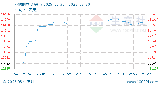 3月30日,生意社不锈钢卷基准价为14262.50元/吨,与本月初持平。