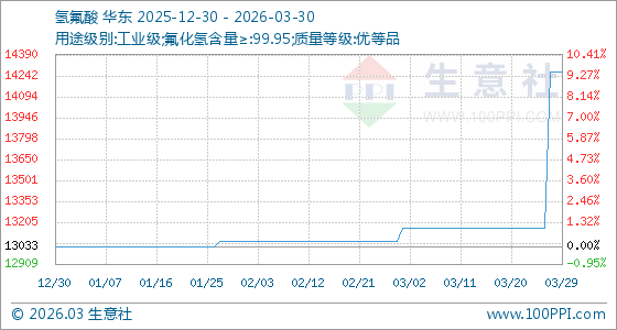 3月30日生意社氢氟酸基准价为14266.67元/吨