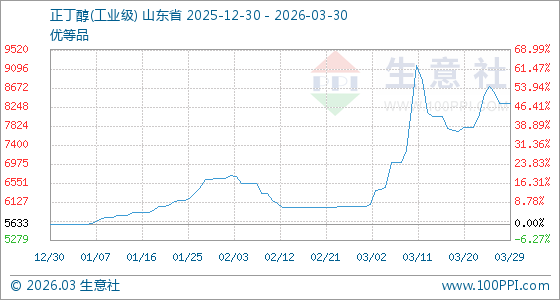 3月30日生意社正丁醇(工业级)基准价为8333.33元/吨