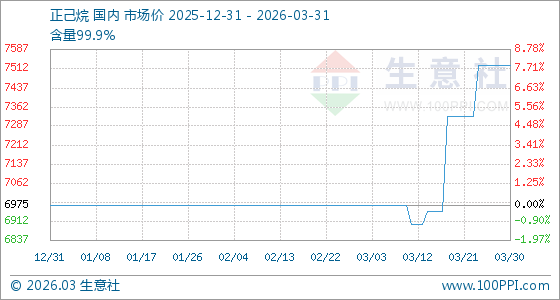3月31日,生意社正己烷基准价为7525.00元/吨,与本月初(6975.00元/吨)相比,上涨了7.89%。