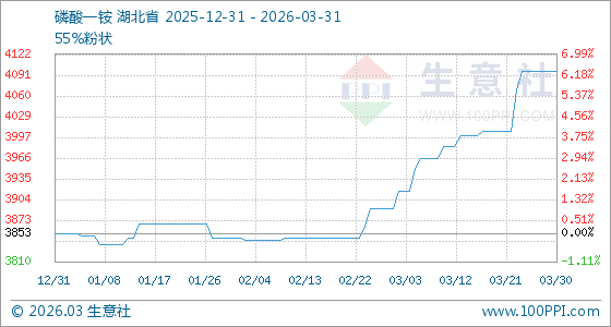 3月31日,生意社磷酸一铵基准价为4096.67元/吨,与本月初(3890.00元/吨)相比,上涨了5.31%。